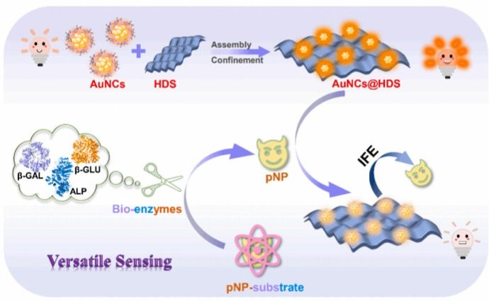 色情网 王冠男教授在传感器领域中科院一区杂志Sensors and Actuators: B. Chemical(IF 8.4)期刊发表了关于将金纳米团簇限制羟基双盐用于生物酶的多功能荧光传感的研究。在本研究中,通过静电限域策略制备了具有高量子产率(QY)和稳定性的固定化金纳米团簇 @层状双氢氧化物(AuNCs@HDS),并且首次对其进行了合理设计,用于对多种重要生物酶进行高效且通用的传感检测。这项工作具有以下特点。(1)AuNCs@HDS 是通过带负电荷的金纳米团簇(...