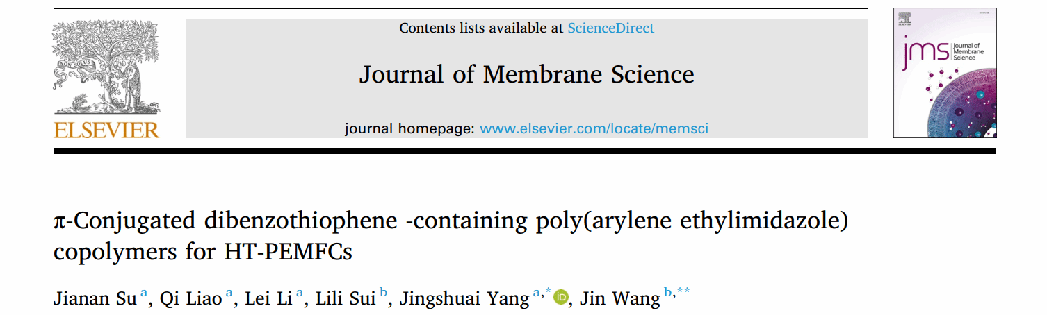 王进副教授与东北大学杨景帅教授课题组合作,在高分子科学一区期刊Journal of Membrane Science(IF:9.0)发表题为《π-Conjugated dibenzothiophene -containing poly(arylene ethylimidazole) copolymers for HT-PEMFCs》的论文。